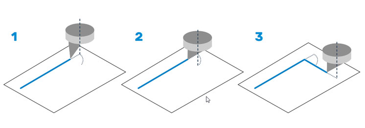 Na rozdíl od tangenciálního řezu, kde motor aktivně natáčí čepel podle dráhy řezu, drag knife (vlečného nože) používá přirozený směr pohybu k udržení přesného vedení nože.