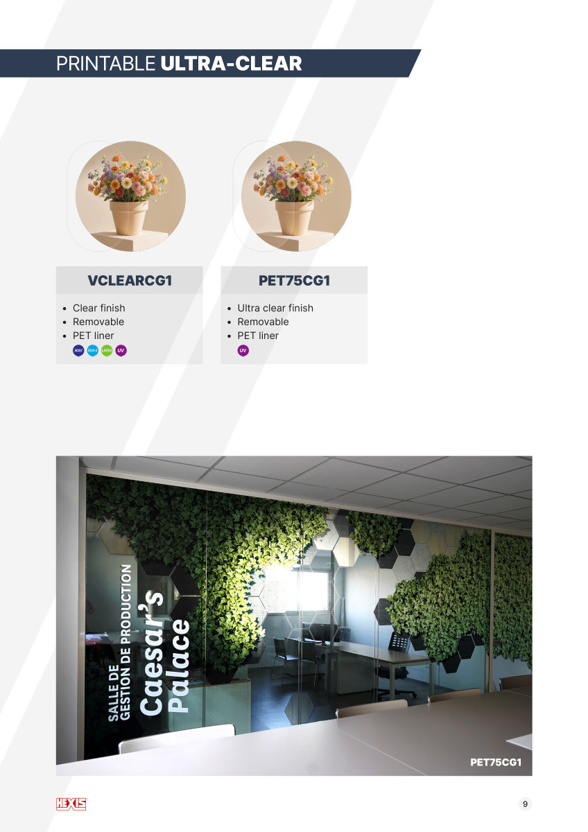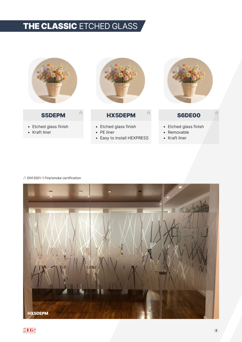 Řada HEXGLASS od společnosti HEXIS nabízí široké spektrum samolepicích fólií určených pro dekoraci, informování i ochranu skla v interiérech i exteriérech. Tyto materiály se používají v kancelářích, obchodních centrech, hotelích, zdravotnických zařízeních, školách, bankách i veřejných budovách .