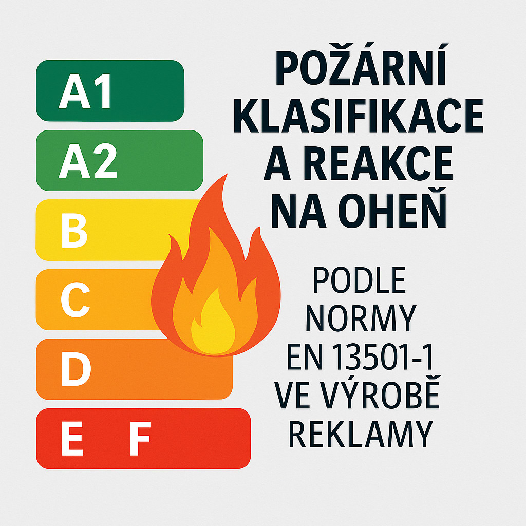 Zejména v interiérech, výstavních prostorách, nákupních centrech nebo veřejných budovách je zásadní, aby všechny použité tiskové materiály, textilie a plastové panely splňovaly požadavky na reakci na oheň podle evropské normy EN 13501-1.