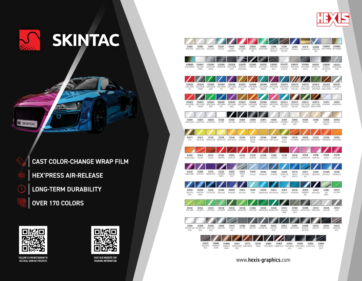 Wrappingové fólie Hexis SKINTAC HX20000 a HX30000 jsou vícevrstvé lité fólie o tloušťce 70 až 280 mic, které jsou speciálně vyvinuty pro celopolepy dopravních prostředků nebo pro aplikace na tvarově složité objekty. Pro rychlou a snadnou aplikaci mají tyto fólie komůrkové lepidlo HEX´PRESS, které také eliminuje tvorbu vzduchových bublin.