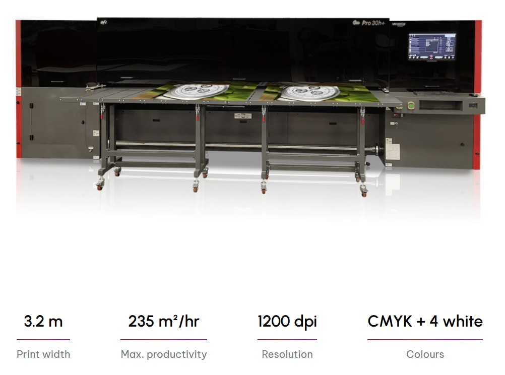 Tiskárna Pro 30h+ je logickým krokem pro ty, kteří chtějí přejít do vyšších objemů výroby. Nabízí šíři 3,2 metru a výkon až 235 m²/hod, takže je ideální pro větší zakázky a rychlé dodací lhůty.