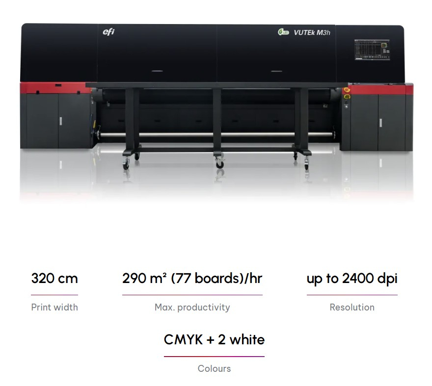 VUTEk M3h je technologicky nejvyspělejší hybridní tiskárna EFI, která kombinuje špičkovou kvalitu obrazu (až 2400 dpi) s vysokým výkonem. Její kontinuální nakládání médií umožňuje tisk bez prostojů a systém automatizovaných vakuových zón se stará o stabilitu i při vysokých rychlostech.